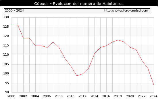 el numero de habitantes en Güexes era de 94, 9 habitantes menos que el en el año 2023. En el grafico siguiente se puede ver cuantos habitantes tiene Güexes a lo largo de los años.