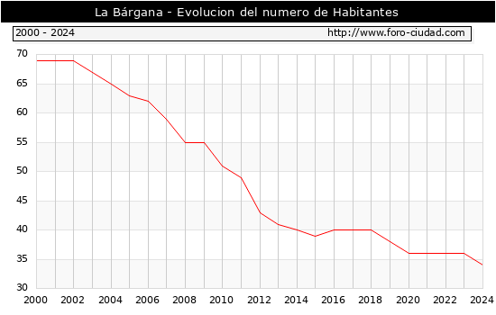 el numero de habitantes en La Bárgana era de 34, 2 habitantes menos que el en el año 2023. En el grafico siguiente se puede ver cuantos habitantes tiene La Bárgana a lo largo de los años.