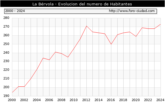 el numero de habitantes en La Bérvola era de 273, 5 habitantes mas que el en el ańo 2023. En el grafico siguiente se puede ver cuantos habitantes tiene La Bérvola a lo largo de los ańos.