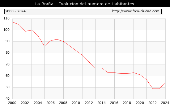 el numero de habitantes en La Braña era de 54, 5 habitantes mas que el en el año 2023. En el grafico siguiente se puede ver cuantos habitantes tiene La Braña a lo largo de los años.