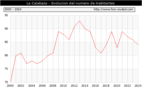 el numero de habitantes en La Calabaza era de 84, 2 habitantes menos que el en el año 2023. En el grafico siguiente se puede ver cuantos habitantes tiene La Calabaza a lo largo de los años.