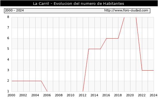 el numero de habitantes en La Carril era de 3, igual numero de habitantes que el en el año 2023. En el grafico siguiente se puede ver cuantos habitantes tiene La Carril a lo largo de los años.