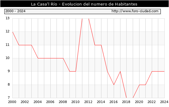 el numero de habitantes en La Casa'l Río era de 9, igual numero de habitantes que el en el año 2023. En el grafico siguiente se puede ver cuantos habitantes tiene La Casa'l Río a lo largo de los años.