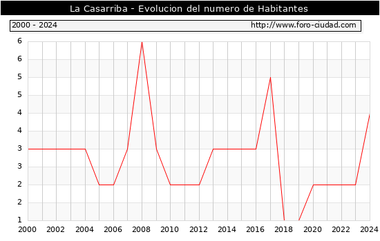 el numero de habitantes en La Casarriba era de 4, 2 habitantes mas que el en el año 2023. En el grafico siguiente se puede ver cuantos habitantes tiene La Casarriba a lo largo de los años.