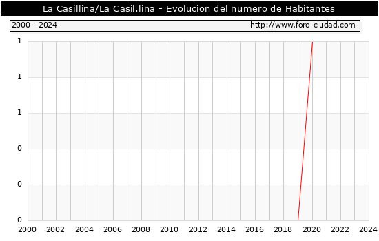 el numero de habitantes en La Casillina/La Casil.lina era de 1, igual numero de habitantes que el en el año 2023. En el grafico siguiente se puede ver cuantos habitantes tiene La Casillina/La Casil.lina a lo largo de los años.
