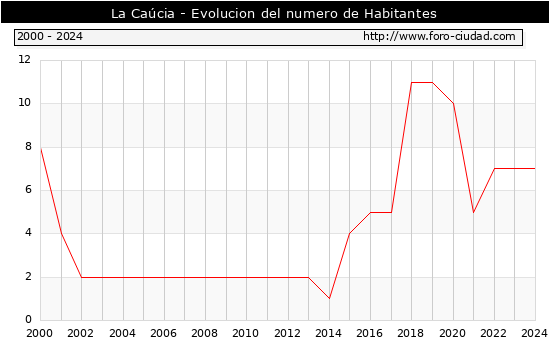 el numero de habitantes en La Caúcia era de 7, igual numero de habitantes que el en el año 2023. En el grafico siguiente se puede ver cuantos habitantes tiene La Caúcia a lo largo de los años.