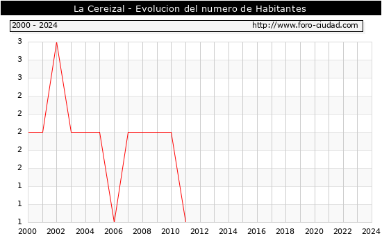 el numero de habitantes en La Cereizal era de 1, igual numero de habitantes que el en el año 2023. En el grafico siguiente se puede ver cuantos habitantes tiene La Cereizal a lo largo de los años.