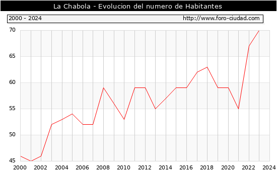 el numero de habitantes en La Chabola era de 70, igual numero de habitantes que el en el año 2023. En el grafico siguiente se puede ver cuantos habitantes tiene La Chabola a lo largo de los años.