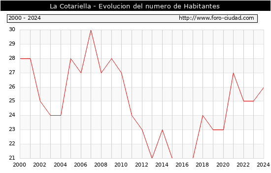 el numero de habitantes en La Cotariella era de 26, 1 habitantes mas que el en el año 2023. En el grafico siguiente se puede ver cuantos habitantes tiene La Cotariella a lo largo de los años.