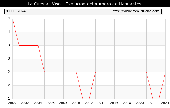el numero de habitantes en La Cuesta'l Viso era de 2, 1 habitantes mas que el en el año 2023. En el grafico siguiente se puede ver cuantos habitantes tiene La Cuesta'l Viso a lo largo de los años.