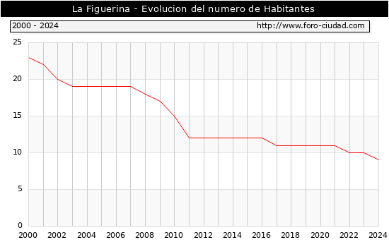 el numero de habitantes en La Figuerina era de 9, 1 habitantes menos que el en el año 2023. En el grafico siguiente se puede ver cuantos habitantes tiene La Figuerina a lo largo de los años.