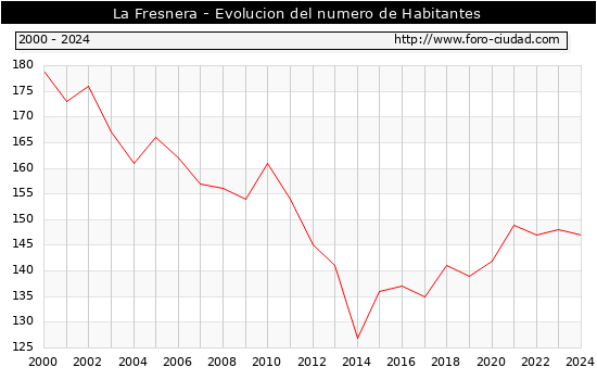 el numero de habitantes en La Fresnera era de 147, 1 habitantes menos que el en el año 2023. En el grafico siguiente se puede ver cuantos habitantes tiene La Fresnera a lo largo de los años.
