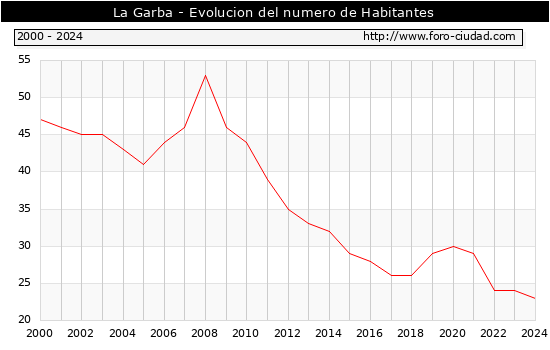 el numero de habitantes en La Garba era de 23, 1 habitantes menos que el en el año 2023. En el grafico siguiente se puede ver cuantos habitantes tiene La Garba a lo largo de los años.