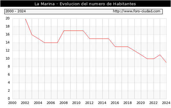 el numero de habitantes en La Marina era de 9, 2 habitantes menos que el en el año 2023. En el grafico siguiente se puede ver cuantos habitantes tiene La Marina a lo largo de los años.