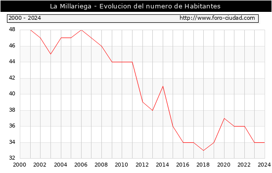 el numero de habitantes en La Millariega era de 34, igual numero de habitantes que el en el año 2023. En el grafico siguiente se puede ver cuantos habitantes tiene La Millariega a lo largo de los años.
