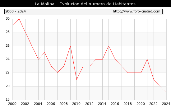 el numero de habitantes en La Molina era de 19, 1 habitantes menos que el en el año 2023. En el grafico siguiente se puede ver cuantos habitantes tiene La Molina a lo largo de los años.
