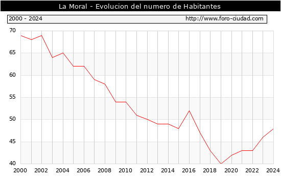 el numero de habitantes en La Moral era de 48, 2 habitantes mas que el en el año 2023. En el grafico siguiente se puede ver cuantos habitantes tiene La Moral a lo largo de los años.