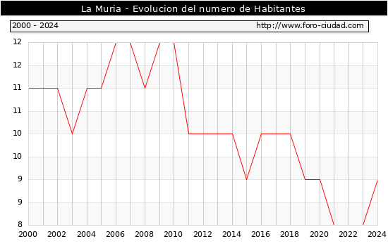 el numero de habitantes en La Muria era de 9, 1 habitantes mas que el en el año 2023. En el grafico siguiente se puede ver cuantos habitantes tiene La Muria a lo largo de los años.