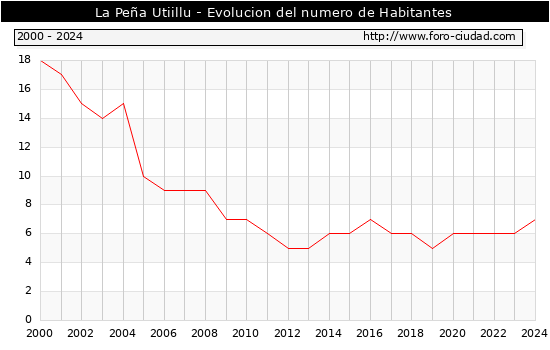 el numero de habitantes en La Peña Utiillu era de 7, 1 habitantes mas que el en el año 2023. En el grafico siguiente se puede ver cuantos habitantes tiene La Peña Utiillu a lo largo de los años.