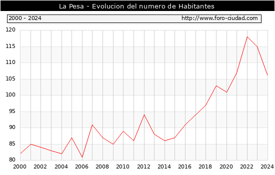 el numero de habitantes en La Pesa era de 106, 9 habitantes menos que el en el año 2023. En el grafico siguiente se puede ver cuantos habitantes tiene La Pesa a lo largo de los años.