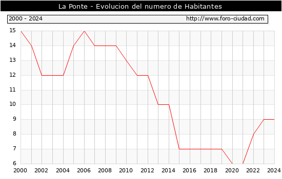 el numero de habitantes en La Ponte era de 9, igual numero de habitantes que el en el año 2023. En el grafico siguiente se puede ver cuantos habitantes tiene La Ponte a lo largo de los años.