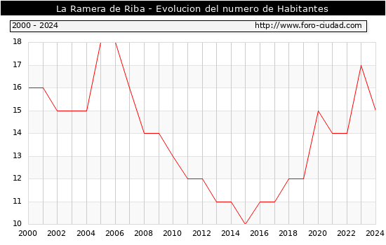 el numero de habitantes en La Ramera de Riba era de 15, 2 habitantes menos que el en el año 2023. En el grafico siguiente se puede ver cuantos habitantes tiene La Ramera de Riba a lo largo de los años.