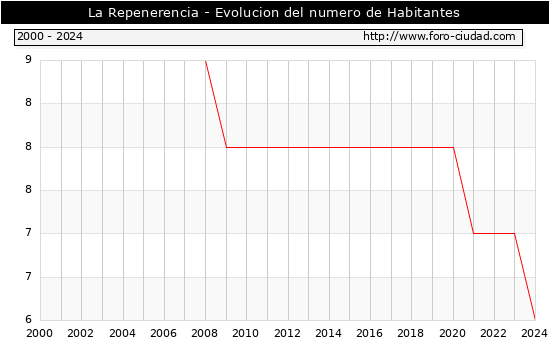 el numero de habitantes en La Repenerencia era de 6, 1 habitantes menos que el en el año 2023. En el grafico siguiente se puede ver cuantos habitantes tiene La Repenerencia a lo largo de los años.