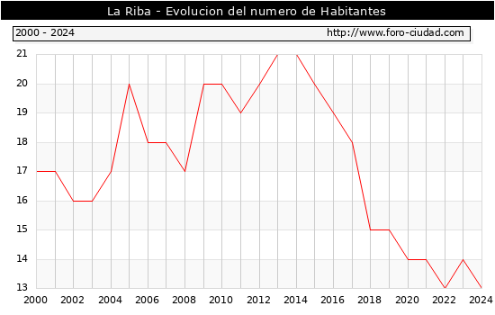 el numero de habitantes en La Riba era de 13, 1 habitantes menos que el en el año 2023. En el grafico siguiente se puede ver cuantos habitantes tiene La Riba a lo largo de los años.