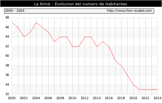 el numero de habitantes en La Rimá era de 33, igual numero de habitantes que el en el año 2023. En el grafico siguiente se puede ver cuantos habitantes tiene La Rimá a lo largo de los años.