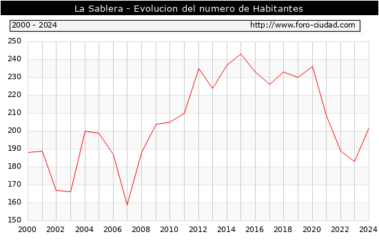 el numero de habitantes en La Sablera era de 202, 19 habitantes mas que el en el año 2023. En el grafico siguiente se puede ver cuantos habitantes tiene La Sablera a lo largo de los años.