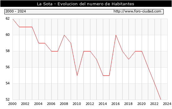 Segun los datos publicados por el INE a 1 de Enero de 2024 el numero de habitantes en La Sota era de 52, igual numero de habitantes que el en el año 2023. En el grafico siguiente se puede ver cuantos habitantes tiene La Sota a lo largo de los años.