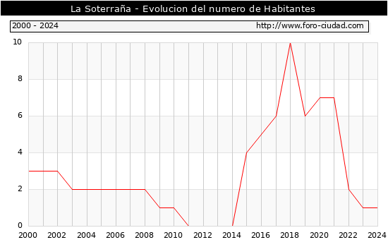 el numero de habitantes en La Soterraña era de 1, igual numero de habitantes que el en el año 2023. En el grafico siguiente se puede ver cuantos habitantes tiene La Soterraña a lo largo de los años.
