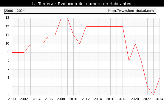el numero de habitantes en La Tornera era de 6, 2 habitantes mas que el en el año 2023. En el grafico siguiente se puede ver cuantos habitantes tiene La Tornera a lo largo de los años.