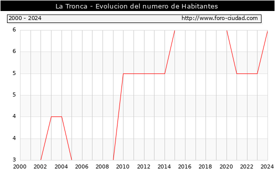 el numero de habitantes en La Tronca era de 6, 1 habitantes mas que el en el año 2023. En el grafico siguiente se puede ver cuantos habitantes tiene La Tronca a lo largo de los años.