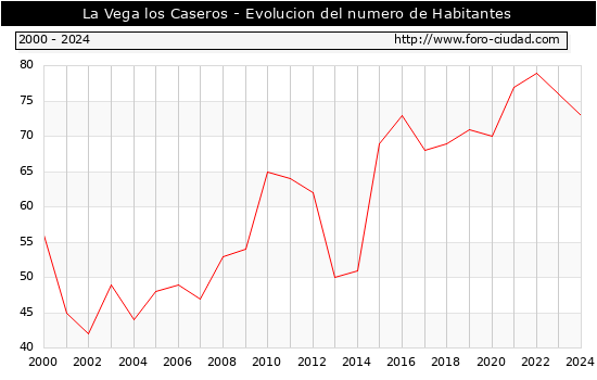 el numero de habitantes en La Vega los Caseros era de 73, 3 habitantes menos que el en el año 2023. En el grafico siguiente se puede ver cuantos habitantes tiene La Vega los Caseros a lo largo de los años.