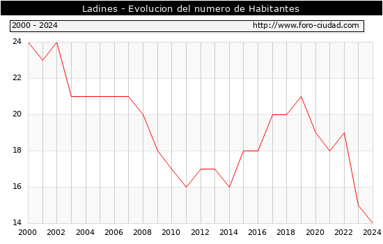 el numero de habitantes en Ladines era de 14, 1 habitantes menos que el en el año 2023. En el grafico siguiente se puede ver cuantos habitantes tiene Ladines a lo largo de los años.