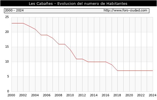 el numero de habitantes en Les Cabañes era de 7, igual numero de habitantes que el en el año 2023. En el grafico siguiente se puede ver cuantos habitantes tiene Les Cabañes a lo largo de los años.