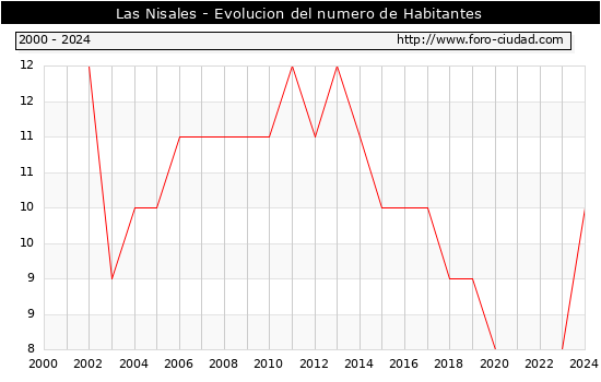 el numero de habitantes en Las Nisales era de 10, 2 habitantes mas que el en el año 2023. En el grafico siguiente se puede ver cuantos habitantes tiene Las Nisales a lo largo de los años.