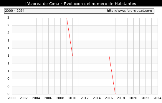 el numero de habitantes en L'Azorea de Cima era de 0, igual numero de habitantes que el en el año 2023. En el grafico siguiente se puede ver cuantos habitantes tiene L'Azorea de Cima a lo largo de los años.