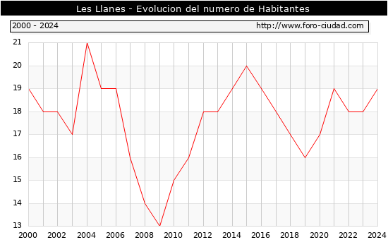 el numero de habitantes en Les Llanes era de 19, 1 habitantes mas que el en el año 2023. En el grafico siguiente se puede ver cuantos habitantes tiene Les Llanes a lo largo de los años.