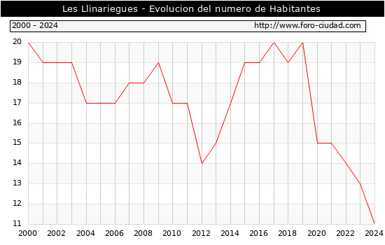 el numero de habitantes en Les Llinariegues era de 11, 2 habitantes menos que el en el año 2023. En el grafico siguiente se puede ver cuantos habitantes tiene Les Llinariegues a lo largo de los años.