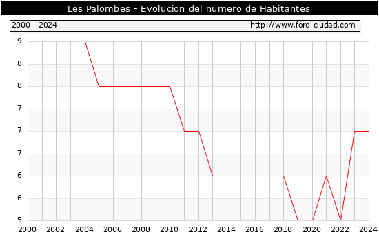 Segun los datos publicados por el INE a 1 de Enero de 2024 el numero de habitantes en Les Palombes era de 7, igual numero de habitantes que el en el año 2023. En el grafico siguiente se puede ver cuantos habitantes tiene Les Palombes a lo largo de los años.