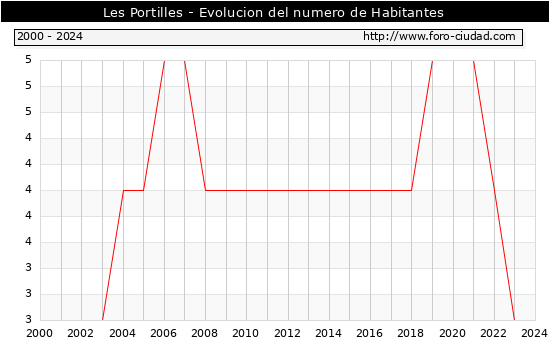 el numero de habitantes en Les Portilles era de 3, igual numero de habitantes que el en el año 2023. En el grafico siguiente se puede ver cuantos habitantes tiene Les Portilles a lo largo de los años.