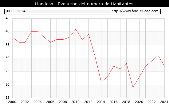 el numero de habitantes en Llandoso era de 27, 4 habitantes menos que el en el año 2023. En el grafico siguiente se puede ver cuantos habitantes tiene Llandoso a lo largo de los años.