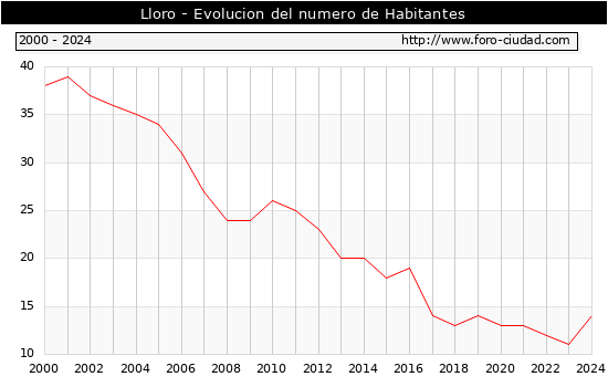 el numero de habitantes en Lloro era de 14, 3 habitantes mas que el en el año 2023. En el grafico siguiente se puede ver cuantos habitantes tiene Lloro a lo largo de los años.