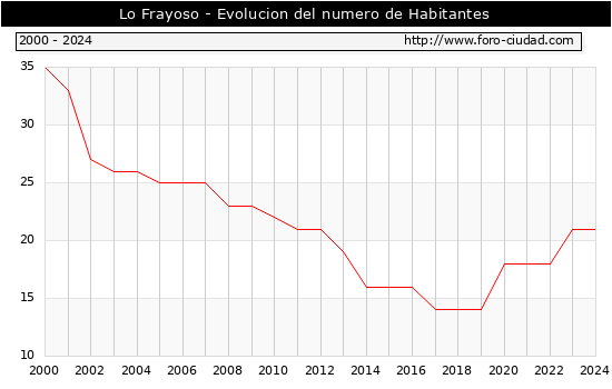 el numero de habitantes en Lo Frayoso era de 21, igual numero de habitantes que el en el año 2023. En el grafico siguiente se puede ver cuantos habitantes tiene Lo Frayoso a lo largo de los años.