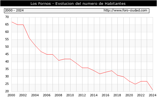 el numero de habitantes en Los Fornos era de 21, 6 habitantes menos que el en el año 2023. En el grafico siguiente se puede ver cuantos habitantes tiene Los Fornos a lo largo de los años.