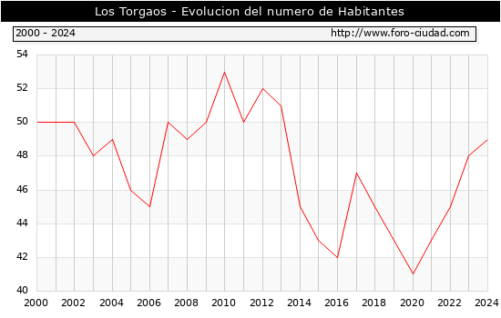 el numero de habitantes en Los Torgaos era de 49, 1 habitantes mas que el en el año 2023. En el grafico siguiente se puede ver cuantos habitantes tiene Los Torgaos a lo largo de los años.