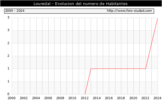 el numero de habitantes en Louredal era de 3, 1 habitantes mas que el en el año 2023. En el grafico siguiente se puede ver cuantos habitantes tiene Louredal a lo largo de los años.