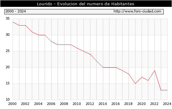 el numero de habitantes en Lourido era de 13, igual numero de habitantes que el en el año 2023. En el grafico siguiente se puede ver cuantos habitantes tiene Lourido a lo largo de los años.